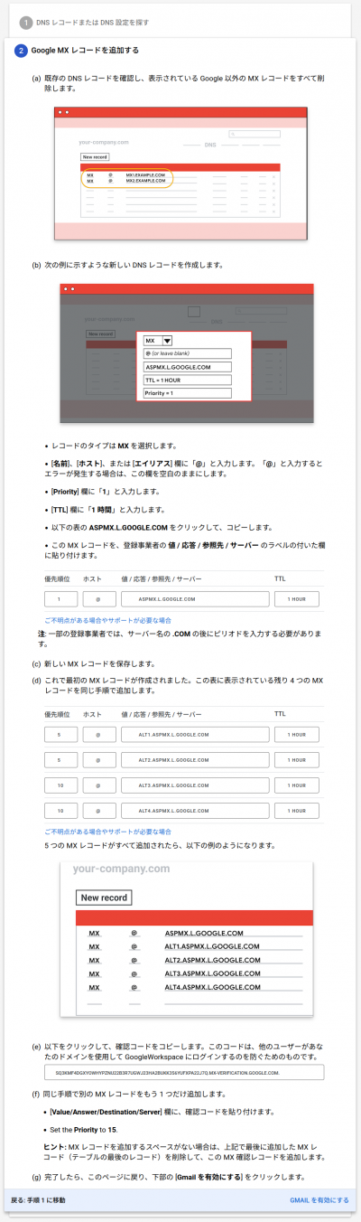 注意1 ドメインの所有権認証がサイト作成時に無かったときはここで設定します。mx 15はGoogle認証用です。先程のページにありますのでコピペします。契約ごとに代わります。