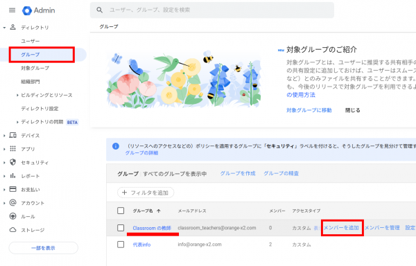 ディレクトリ>グループ>Classroom の教師>メンバーを追加。(ここから登録すると、一度にまとめて教師アカウントを複数追加でき早いのでおすすめです。)