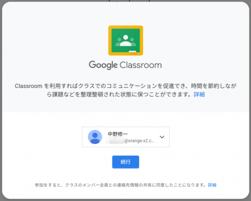 ブラウザが複数Gmailアカウントログインしたことがあるようなら、どのアカウントでクラスを作るか聞いてきますので、教員アカウントを選びます。
