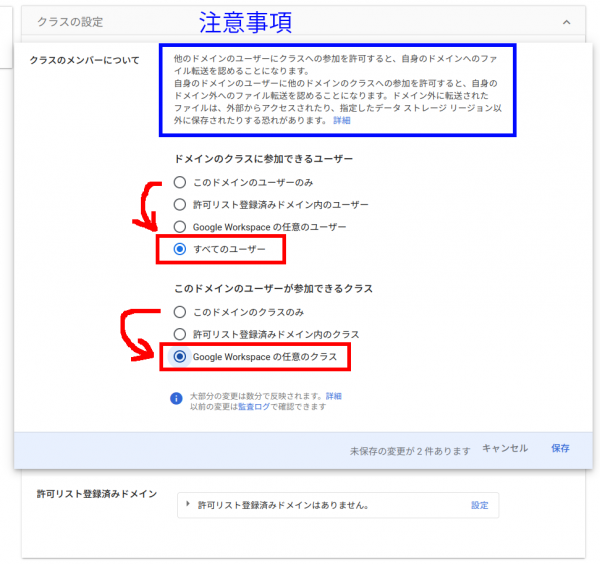 ・このドメインから参加できるのはGoogle Workspaceの任意のクラス(他の大学のクラスにも参加できるようにします)