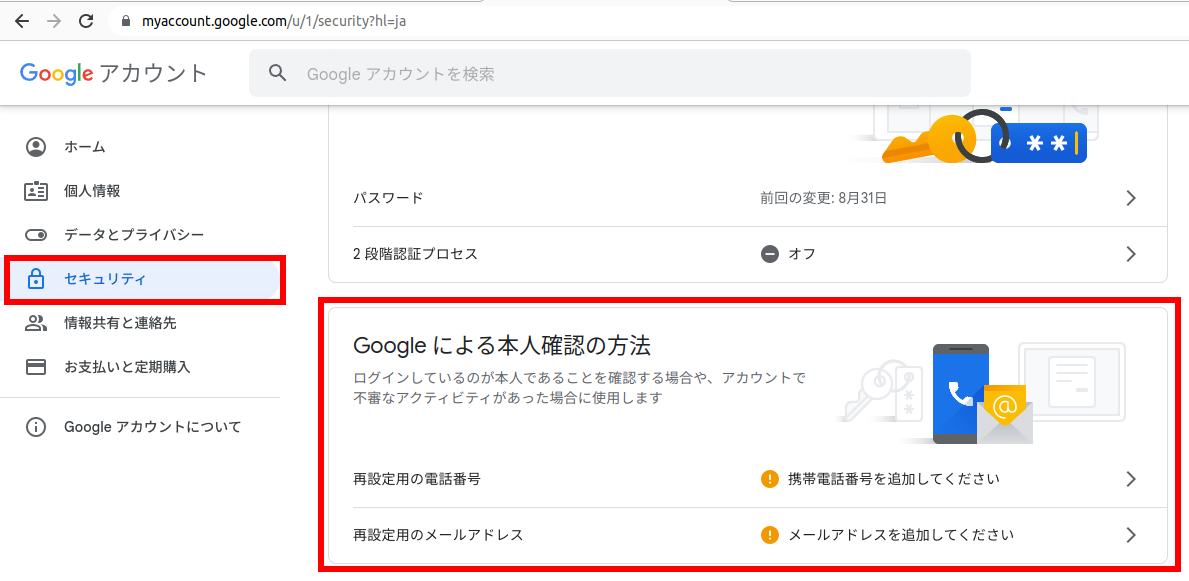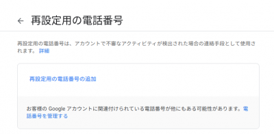 またパスワードを忘れたときGoogle Workspaceでは管理者に強制リセットしてもらうこともできますが、自身でもできるよう、パスワードを忘れたときのための再設定用メールアドレスと携帯番号を登録しておくことをおすすめします。