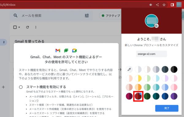 ブラウザがChromeの場合は「新しいプロファイルで続行しますか?」と尋ねられます。「OK」をクリックすると「新しいプロファイル」が作られてアカウントを切り替える毎にブラウザの色を変えるなどすることができます。