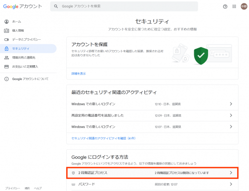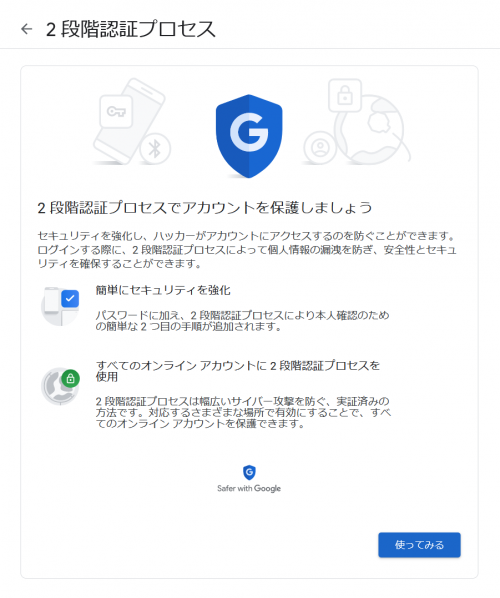 セキュリティ>アカウント保護>[Google へのログイン] で[2 段階認証プロセス] を選択>[使ってみる]