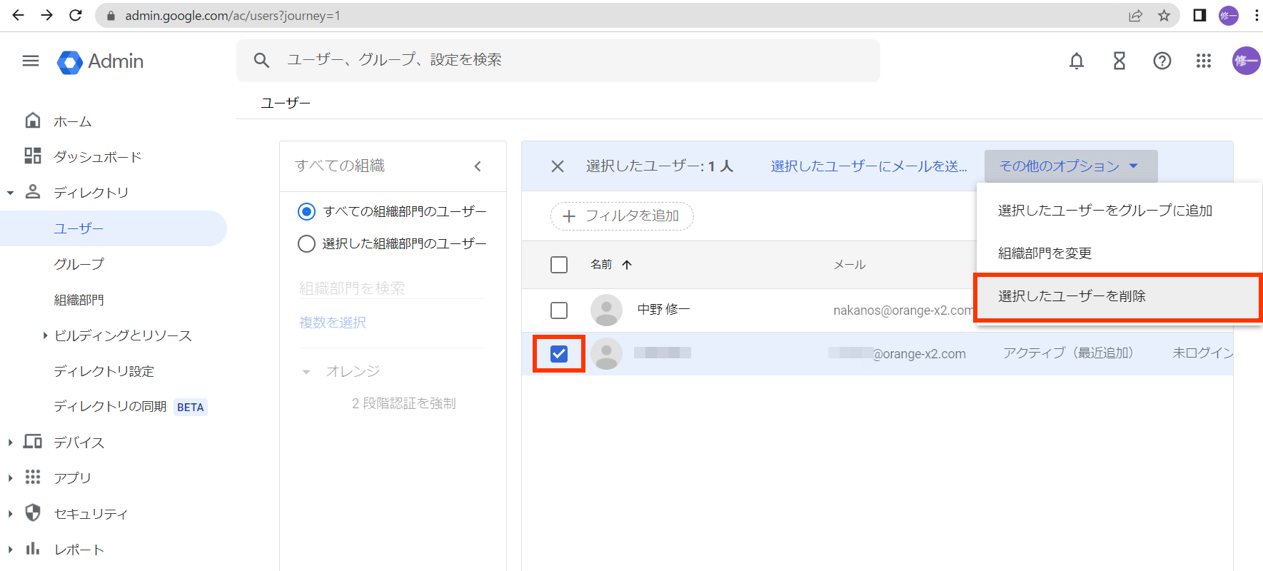 ユーザ>削除したいユーザを選択し、「その他のオプション」>[選択したユーザーを削除]